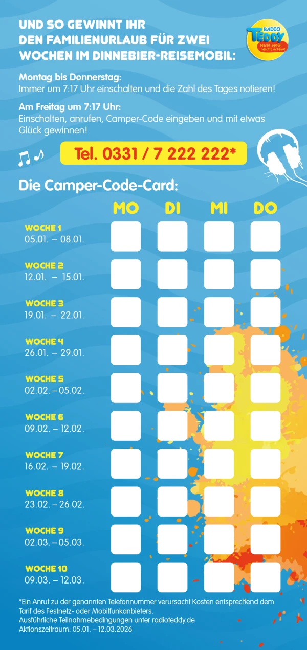 Gewinnen ist so einfach: Hört jeden Morgen um 07:17 Uhr Radio TEDDY einschalten, merkt euch die Camper-Code-Zahl des Tages und am Freitag heißt es dann: Code eingeben, Tresor öffnen und schon startet euer Weg in einen unvergesslichen Familien-Wohnmobilurlaub.